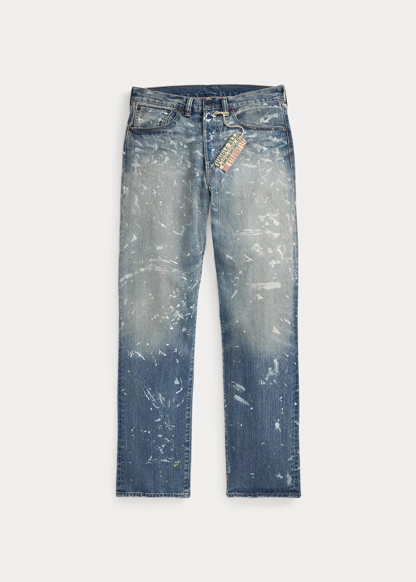 Straight-fitting jeans made from 12.6 oz. left-hand twill. Yarn-dyed with true indigo. Button-fly construction inspired by denim styles from the late ’60s. Hand-applied paint splatters throughout. Sanforized® to minimize shrinkage. DETAILS - Straight Fit: a regular rise and a straight leg. - Size 32W has a 10" rise and a 16.75" leg opening. - Hand-set chain-stitched waistband with inserted belt loops for added durability. Button fly with our signature buttoned closure ensures a consistent fit through years of wear. - American-made buttons and rivets. Five-pocket styling. Hand-applied paint splatters throughout. Cotton twill pocket lining. - “RRL”-debossed logo label at the back right waist. - 100% cotton. - Machine washable. For best results, wear 90 days without washing. - Imported. - Dyed with true indigo, which may rub off onto fabrics, leather, and upholstery. - Style Number: 100064985