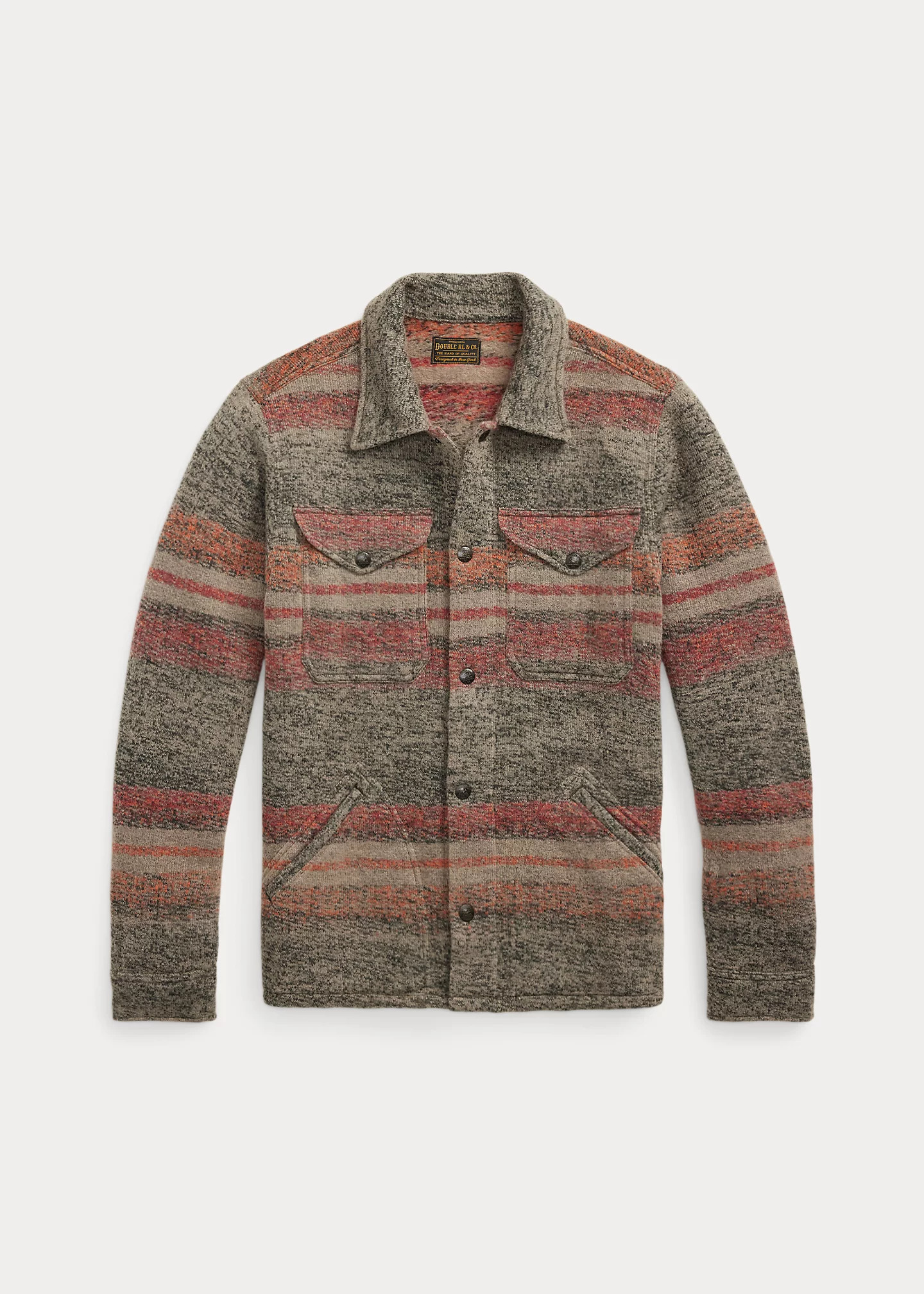 Classic work jacket model made from double-knit birdseye jacquard. Striped pattern and color palette inspired by a vintage equestrian blanket. Woven reinforcements at the interior. Chamois lining at the hand-warmer pockets. Signature snaps with an antiqued-brass finish. DETAILS - Size medium has a 28.25" front body length, a 27.25" back body length, an 18" shoulder, a 45.5" chest, and a 34.75" sleeve length. Sleeve length is taken from the center back of the neck. - Straight collar. Snapped placket. Metal snaps custom-developed with a “Double RL Ralph Lauren Manhattan N.Y.” logo. - Long sleeves with snapped barrel cuffs. - Two chest snapped pockets. Two hand-warmer pockets with chamois lining. - Woven reinforcements at the interior. - 79% wool, 21% polyester (exclusive of trim). - Dry clean. - Imported. - Style Number: 100062168