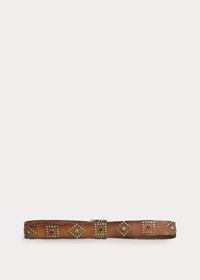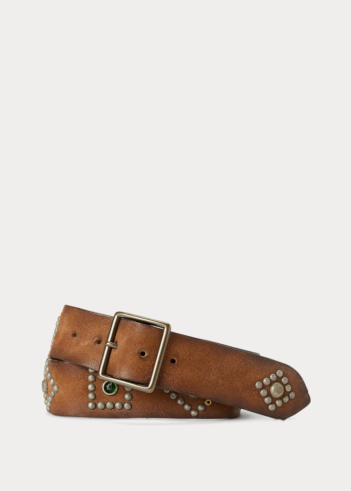 Inspired by a 1930s Western belt. Made in Italy from hand-distressed roughout leather and finished with studs and stones. DETAILS - 1½" wide. - Single-prong square brass buckle. - Pointed tip. - Studded pattern with glass stones. - Leather, glass stones. - Made in Italy. Style Number: 383881