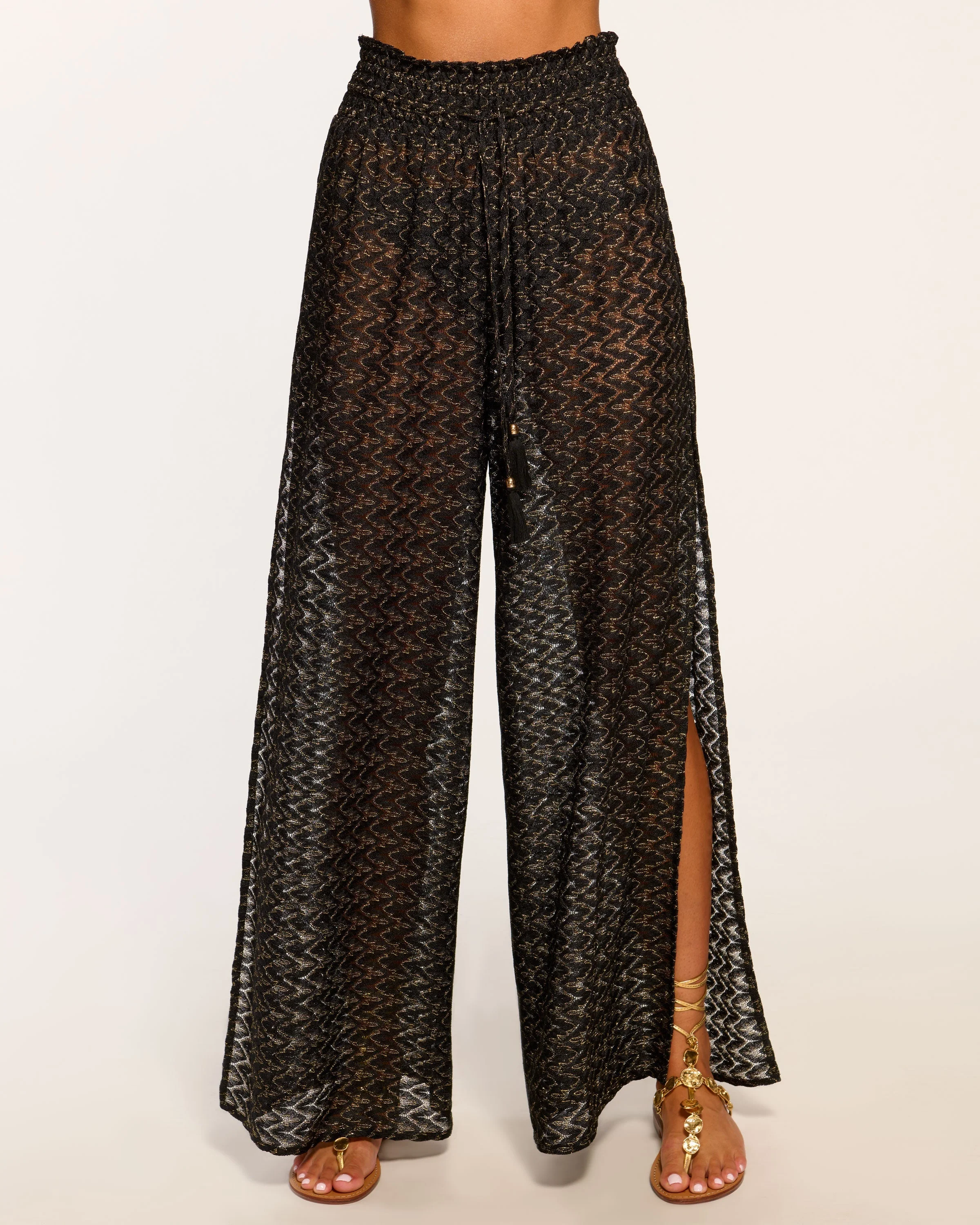 Make your vacation wish come true in the Glora, a relaxed pair of chevron knit pants here to improve your poolside attire. Whether paired with the matching Elvira or a simple bikini top, lap up the sunlight and the limelight in this head turning style. Details & Care – Unlined – Full Length with Slit – Dry Clean or Hand Wash – Style #: C09245000 – 96% Polyester 2% Metallic 2% Nylon Size & Fit – Model is Wearing Size XS – Model is 5'9"