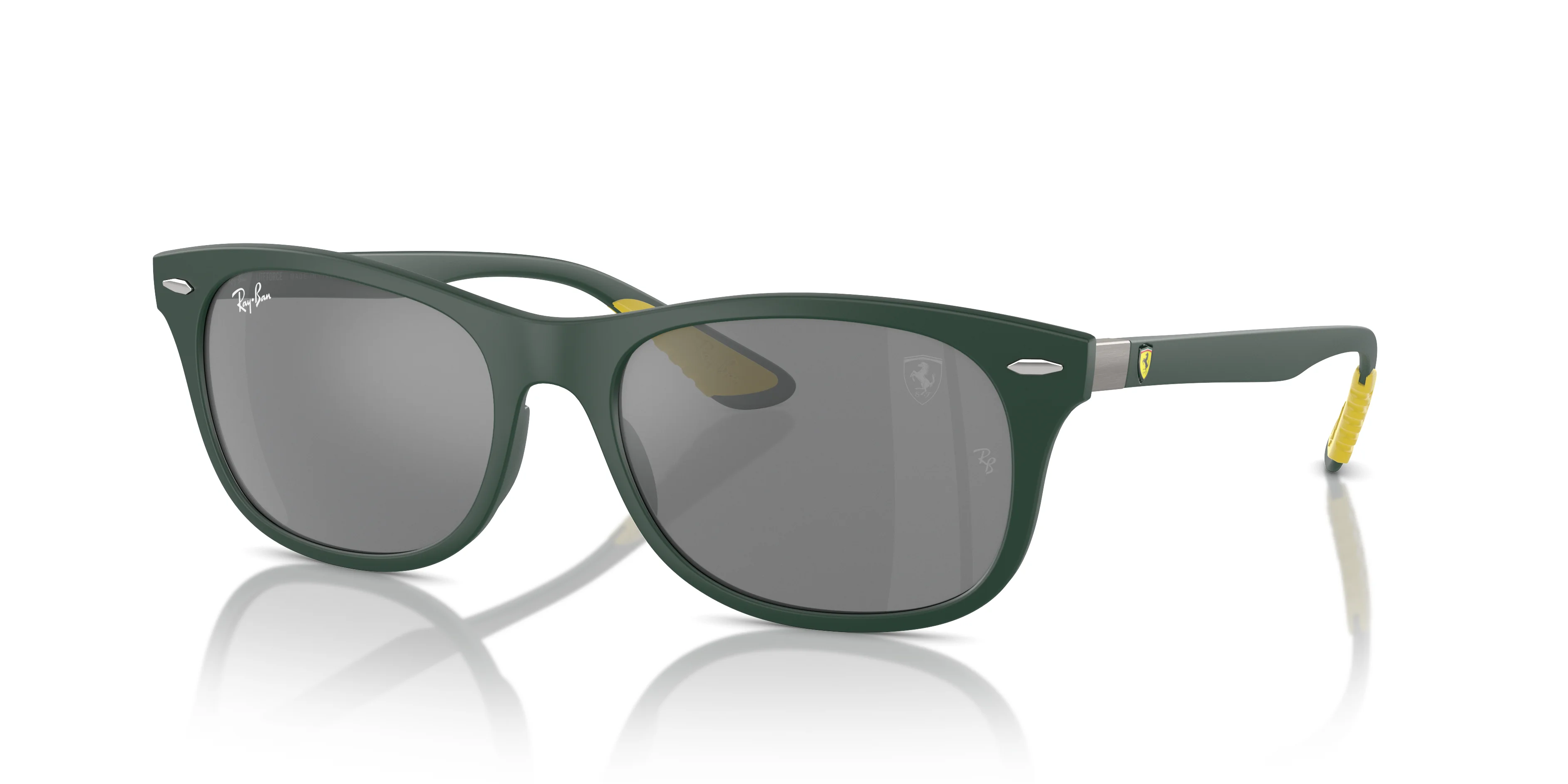 MODEL CODE RB4607M F6996G 55-17 FRAME DESCRIPTION FRAME SHAPE Square FRAME COLOR Matte Green FRAME MATERIAL Peek TEMPLE COLOR Green LENS INFORMATION LENS COLOR Grey TREATMENT Solid Color - Mirror PRODUCT DIMENSIONS HINGE TO HINGE 136 mm LENS HEIGHT 41.2 mm BRIDGE WIDTH 5517 mm TEMPLE LENGTH 145 mm FITTING FITTING Standard BRIDGE & NOSEPADS High Bridge Fit