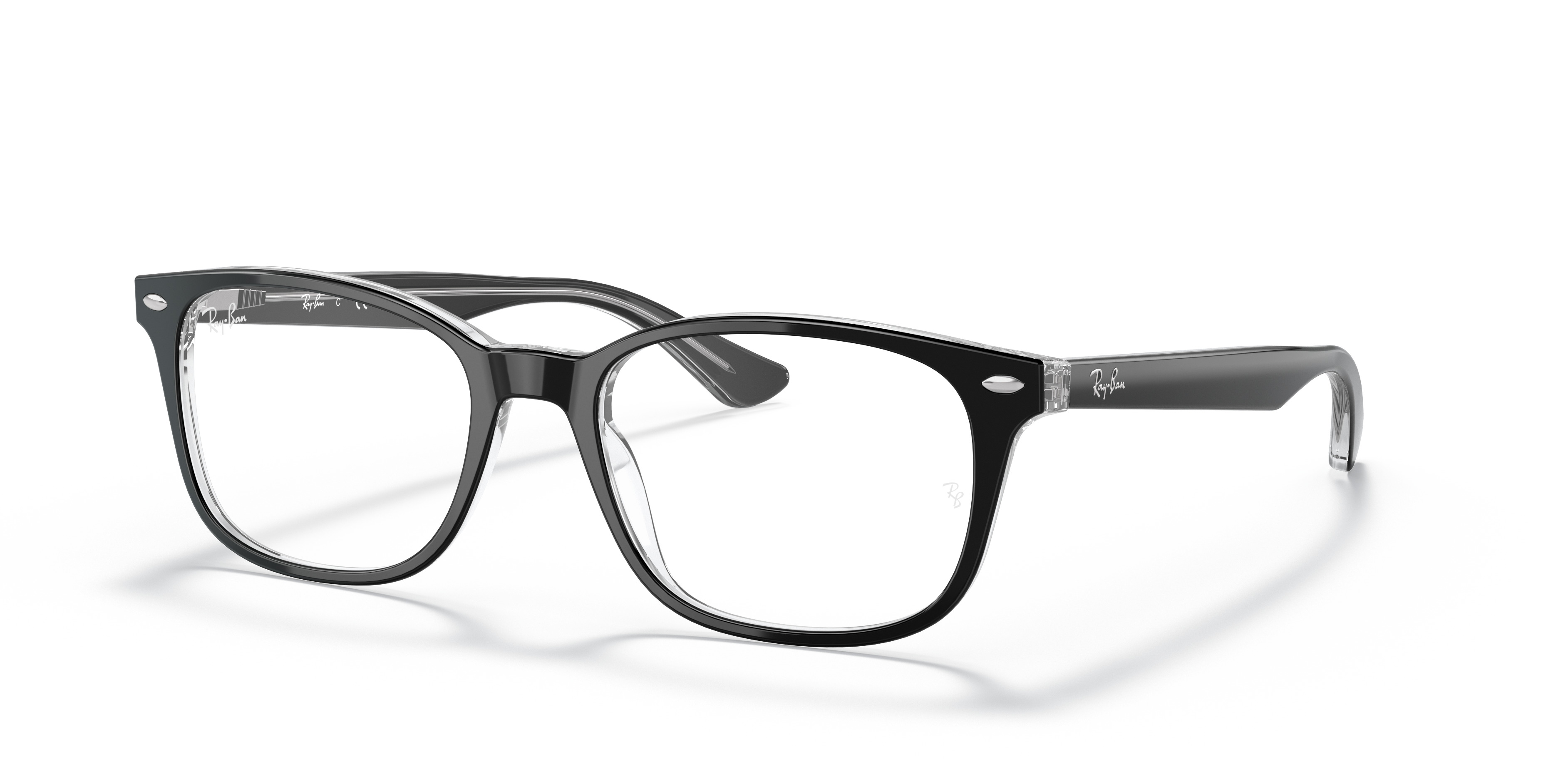 MODEL CODE RB5375 2034 53-18 FRAME DESCRIPTION FRAME SHAPE Square FRAME COLOR Polished Black On Transparent FRAME MATERIAL Acetate TEMPLE COLOR Black LENS INFORMATION LENS COLOR Clear TREATMENT Demo Lens PRODUCT DIMENSIONS HINGE TO HINGE 130 mm LENS HEIGHT 39.3 mm BRIDGE WIDTH 5318 mm TEMPLE LENGTH 145 mm FITTING FITTING Regular BRIDGE & NOSEPADS High Bridge Fit