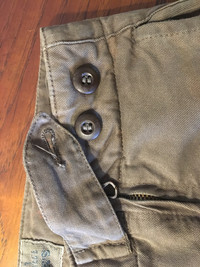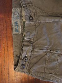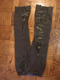 Masons Reversible cargo pants Button fly closure 2 way zips down the legs (full length) Ribs at ankles Straps with buttons to adjust waist fit 2 pockets at waist 4 pockets on the legs 2 back pockets Heavy and super sturdy Camouflage lining throughout / camouflage look when worn inside out Great condition (see pictures) Size 30 Measurements: Waist: 14” 1/2 Rise: 11” Inseam: 31” Outseam: 41”
