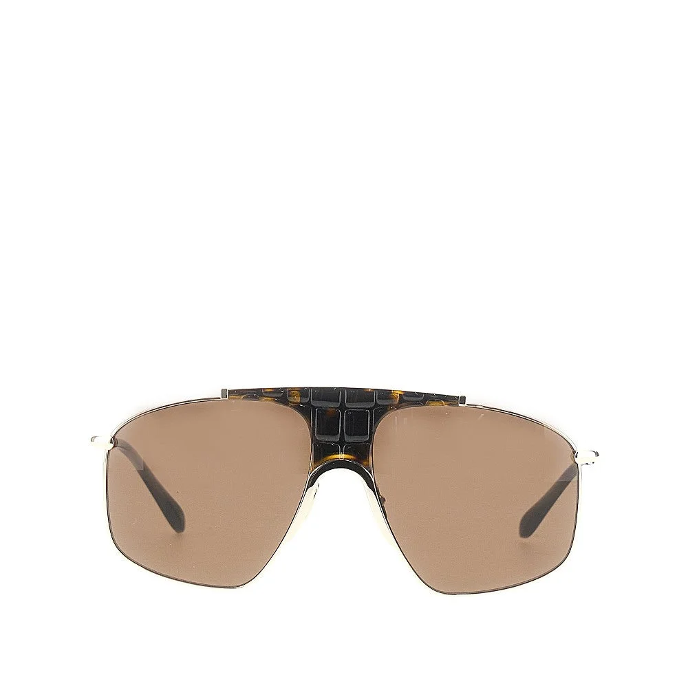Aviatore sunglasses featuring gold-finished metal slim frame, enriched with tortoiseshell-effect acetate details with embossed croco-effect texture. Engraved lettering logo on the temples. DETAILS Model code: AA0098S-002 Color code: GOLD BROWN Season: SS26 Material: 70% ME, 30% AC Made in: Japan Sku: 35053 Color: Brown Brand: ALAIA