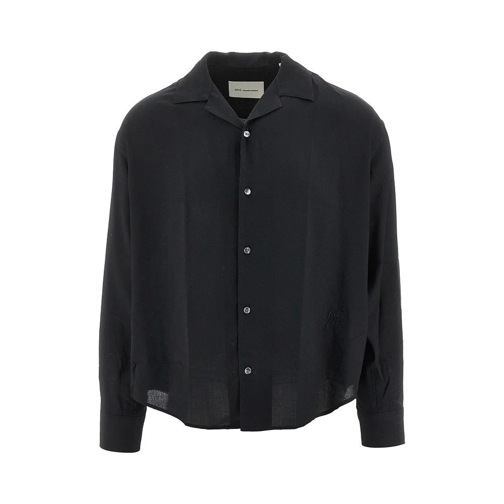 Shirt made from lightweight viscose fabric, enriched with tone-on-tone Ami de Coeur logo embroidery at front bottom side. Mother-of-pearl buttons closure, bowling collar and one-button rounded cuffs. Boxy fit with rounded hem and slightly dropped shoulders. DETAILS Model code: HSH829 Color code: 001 Season: SS26 Material: 100% VI Made in: Bulgaria Sku: 34168 Color: Black Brand: AMI