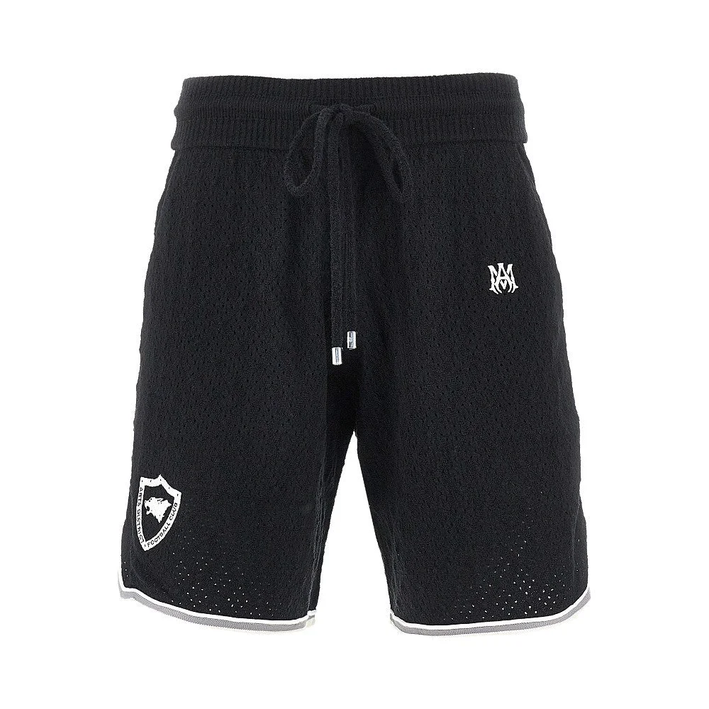 Shorts made from cotton-blend knit with openworked motif and contrasting piping, enriched with crest embroidery on the right leg bottom and "MA Icon" logo embroidery on the left hip. Adjustable elasticated waist with internal drawstring. Side slanted pockets. Unlined. DETAILS Model code: AMBMSO1011 Color code: 001 Season: SS26 Material: 75% CO, 25% PA Made in: Tunisia Sku: 32002 Color: Black Brand: AMIRI