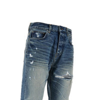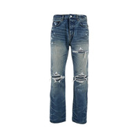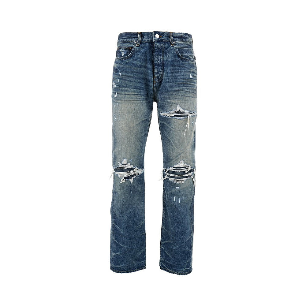 Five-pocket jeans made from cotton denim with fadings and distressed effect, featuring frayed rips with quilted denim lining. Belt loops, buttons fly and button closure. Regular fit with straight leg. Leather logo patch at waist back. DETAILS Codice Modello: AMDNGH1087 Stagione: FW25 Materiale: 100% CO Made in: United States Sku: 23699 Brand: AMIRI