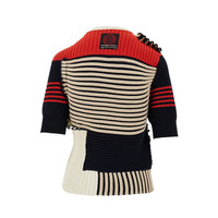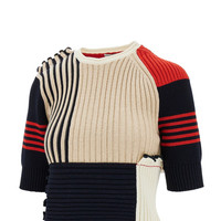 Knitted top made from pure cotton yarn with ribbed motif, featuring patchwork design with some "unfinished" hems. Crewneck with rolled hem. Elbow-length sleeves. Logo label on the back of neck. Regular fit. DETAILS Codice Modello: 811501 Stagione: SS25 Materiale: 100% CO Made in: Italy Sku: 18504 Brand: BOTTEGA VENETA
