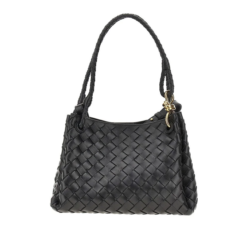 Bag made from double-face soft leather with signature Intrecciato motif, enriched with metal "Knot" detail on the front handle side. Equipped with detachable and adjustable shoulder strap. Magnetic closure. Unlined. Gold-finished metalware. DETAILS Height: 19 cm Depth: 17,5 cm Width: 29 cm Codice Modello: 835921 Stagione: FW25 Materiale: 100% LH Made in: Italy Sku: 26824 Brand: BOTTEGA VENETA
