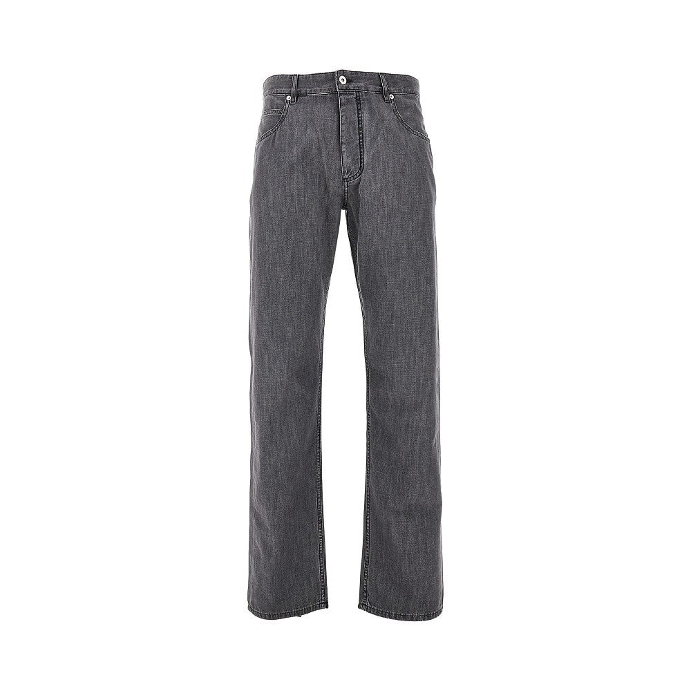 Five-pocket jeans made from lightweight cotton denim with Vintage Black wash, featuring suede leather patch with signature Intrecciato motif at waist back. Belt loops, buttons fly and button closure. Regular fit with straight leg. DETAILS Codice Modello: 813511 Stagione: FW25 Materiale: 100% CO Made in: Italy Sku: 26846 Brand: BOTTEGA VENETA