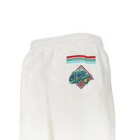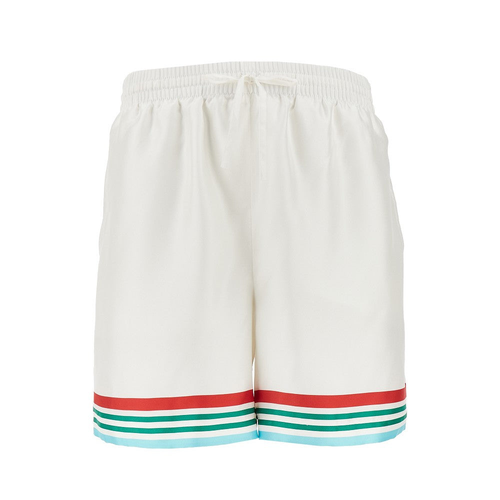 Shorts made from pure silk twill with multicoloured striped motif at hem, featuring rear patch pocket with "Casa Way World Series" graphic print. Adjustable elasticated waist with drawstring. Side inseam pockets. Lined. Regular fit. DETAILS Codice Modello: MS25-TR-012-04 Stagione: SS25 Materiale: 100% SE Made in: Italy Sku: 24496 Brand: CASABLANCA