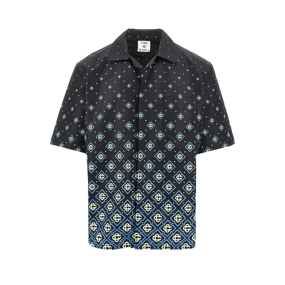 Short-sleeved shirt made from technical swim fabric, enriched with degrade Mnogram pattern. Bowling collar, concealed buttons closure, chest patch pocket and side slits at bottom hem. Mesh lining. Straight and regular cut. DETAILS Model code: MSP26SWM04801EXBC Color code: DEGRADE BLACK Season: SS26 Material: 100% PL Made in: Portugal Sku: 33095 Color: Black Brand: CASABLANCA