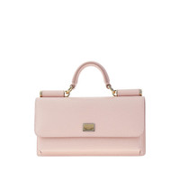 Mini bag made from Dauphine print leather, enriched with signature double-finished metal plate with engraved logo. Leather top handle and detachable chain strap. Flap with magnetic closure. Moire fabric and leather interior with a zippered pocket and four card slots. Gold-finished metalware. DETAILS Height: 11 cm Depth: 3 cm Width: 20 cm Strap: 120 cm Model code: BI3280 Color code: 8H402 Season: SS26 Material: 100% LH Made in: Italy Sku: 32350 Color: Pink Brand: DOLCE&GABBANA