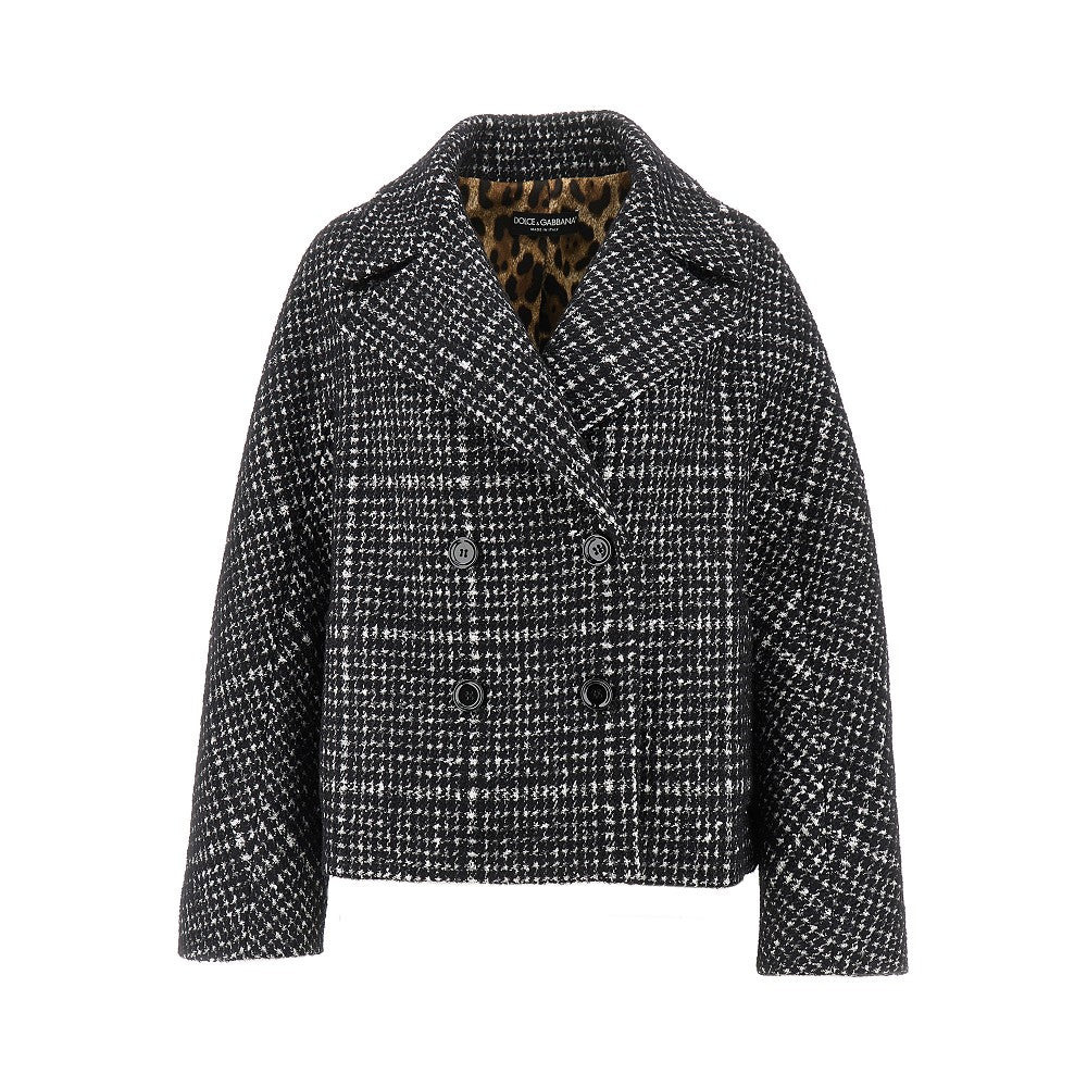 Jacket made from wool, alpaca, mohair and silk blend tweed with houndstooth motif. Double-breasted buttoning, V-neck with wide lapels and side welt pockets. Stretch satin lining with leopard motif. Regular fit. DETAILS Codice Modello: F27GDT Stagione: FW25 Materiale: 50% WV, 12% WM, 12% WP, 11% SE, 9% PA, 5% PL, 1% CO Made in: Italy Sku: 26283 Brand: DOLCE&GABBANA