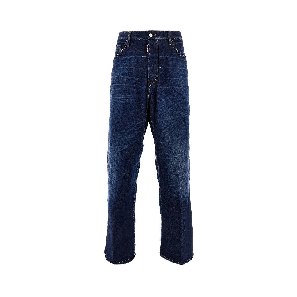 Five-pocket jeans made from dark wash stretch cotton denim with light fadings, featuring loose fit with wide leg and dropped crotch. Belt loops, buttons fly and silver-finished metal branded button closure. Leather logo label at waist back. DETAILS Codice Modello: S74LB1715 Stagione: FW25 Materiale: 98% CO, 2% EA Made in: Romania Sku: 23421 Brand: DSQUARED2