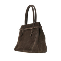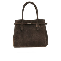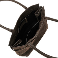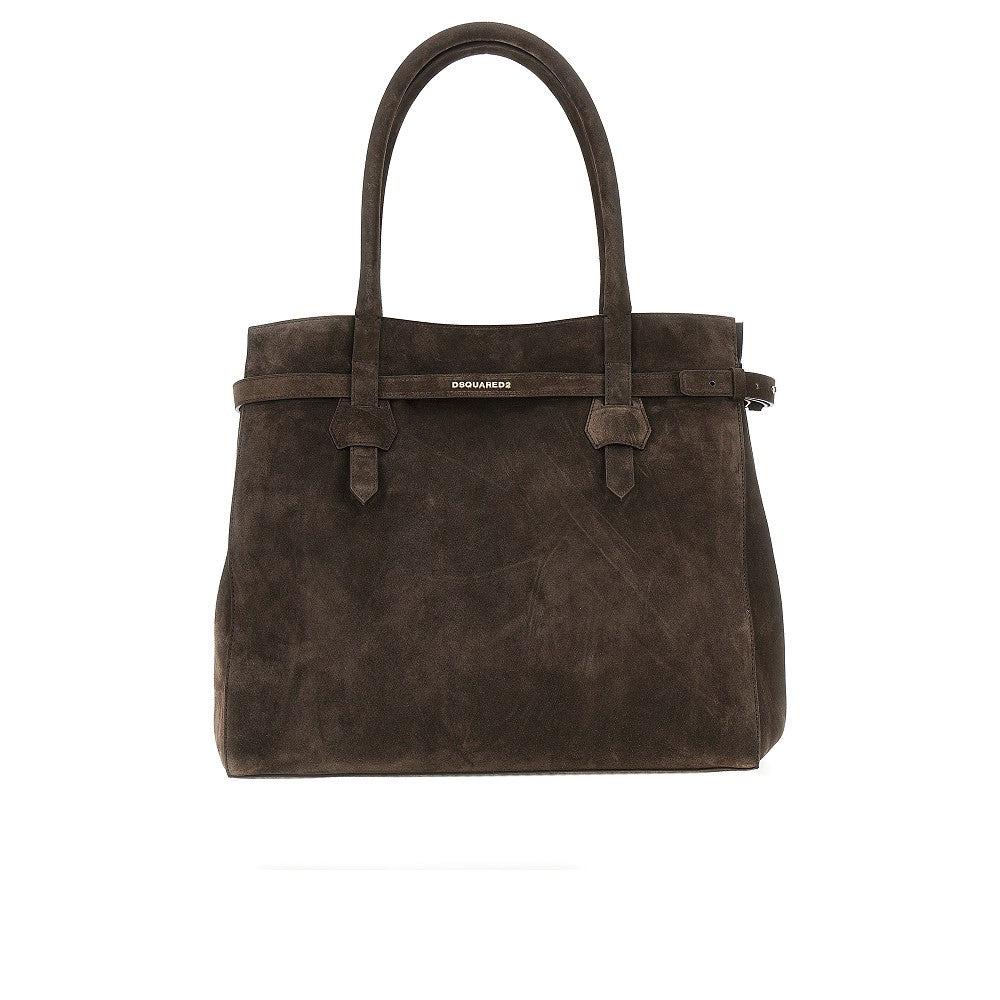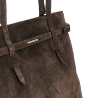 Shopping bag made from suede leather, featuring adjustable wrapping strap enriched with gold-finished metal lettering logo at front. Double handle. Magnetic closure. Twill-lined interior with a patch pocket and a zippered one. DETAILS Height: 35 cm Depth: 23 cm Width: 39 cm Codice Modello: SPM0106 Stagione: FW25 Materiale: 100% LH Made in: Italy Sku: 25157 Brand: DSQUARED2