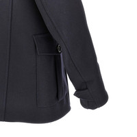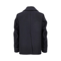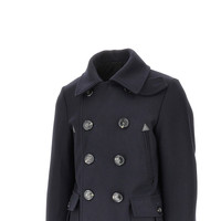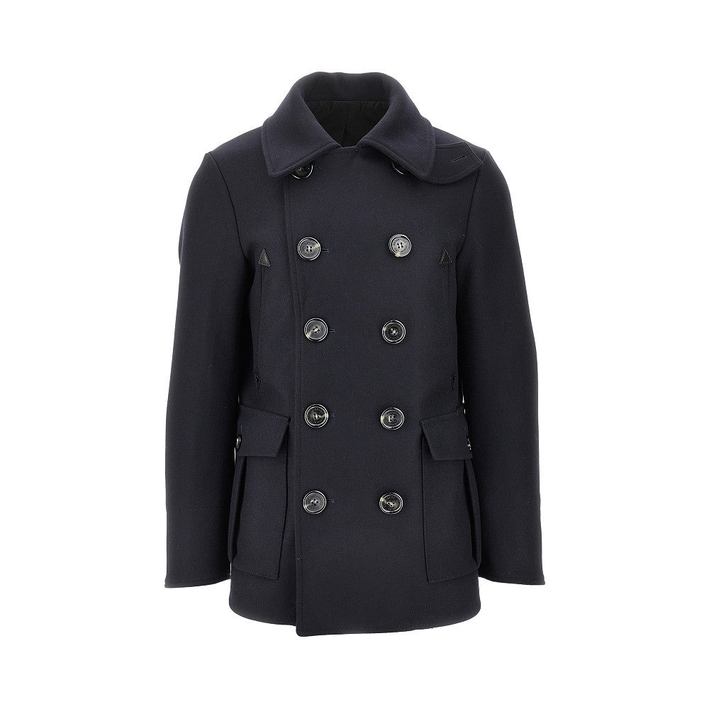 Peacoat made from wool-blend felted cloth with leather trims. Double-breasted buttoning, wide collar with detachable under-chin tab, side patch pockets with button-down flap, handwarmer welt pockets, adjustable wrist hem with press-stud and rear middle split. Viscose-blend lining. DETAILS Codice Modello: S74AA0323 Stagione: FW25 Materiale: 74% WO, 25% PA, 1% EA Made in: Italy Sku: 25535 Brand: DSQUARED2