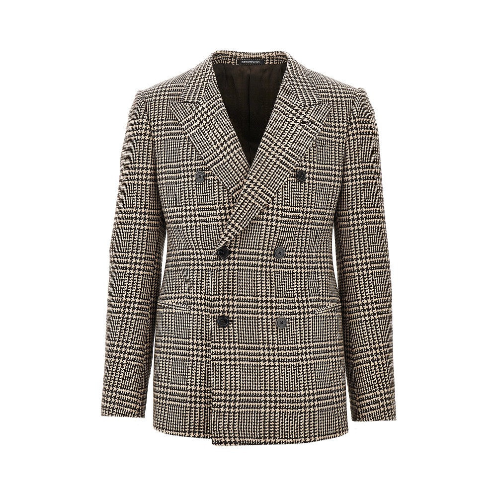 Jacket made from soft wool-blend fabric with Prince of Wales motif. Double-breasted buttons closure, peak lapel collar, side welt pockets, trimmed chest pocket and buttoned cuffs. Regular fit with structured shoulders. Lined. DETAILS Model code: EM003563 Color code: F6067 Season: FW25 Material: 80% WV, 20% PA Made in: Italy Sku: 28823 Color: Brown Brand: EMPORIO ARMANI