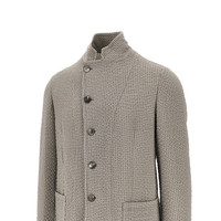 Jacket made from slightly stretch wool fabric with 3D-effect knitting, featuring signature guru collar. Decentralized buttoning. Side patch pockets. Regular fit. Unlined. DETAILS Codice Modello: EM000144 Stagione: FW25 Materiale: 82% WV, 16% PA, 2% EA Made in: Romania Sku: 27711 Brand: EMPORIO ARMANI