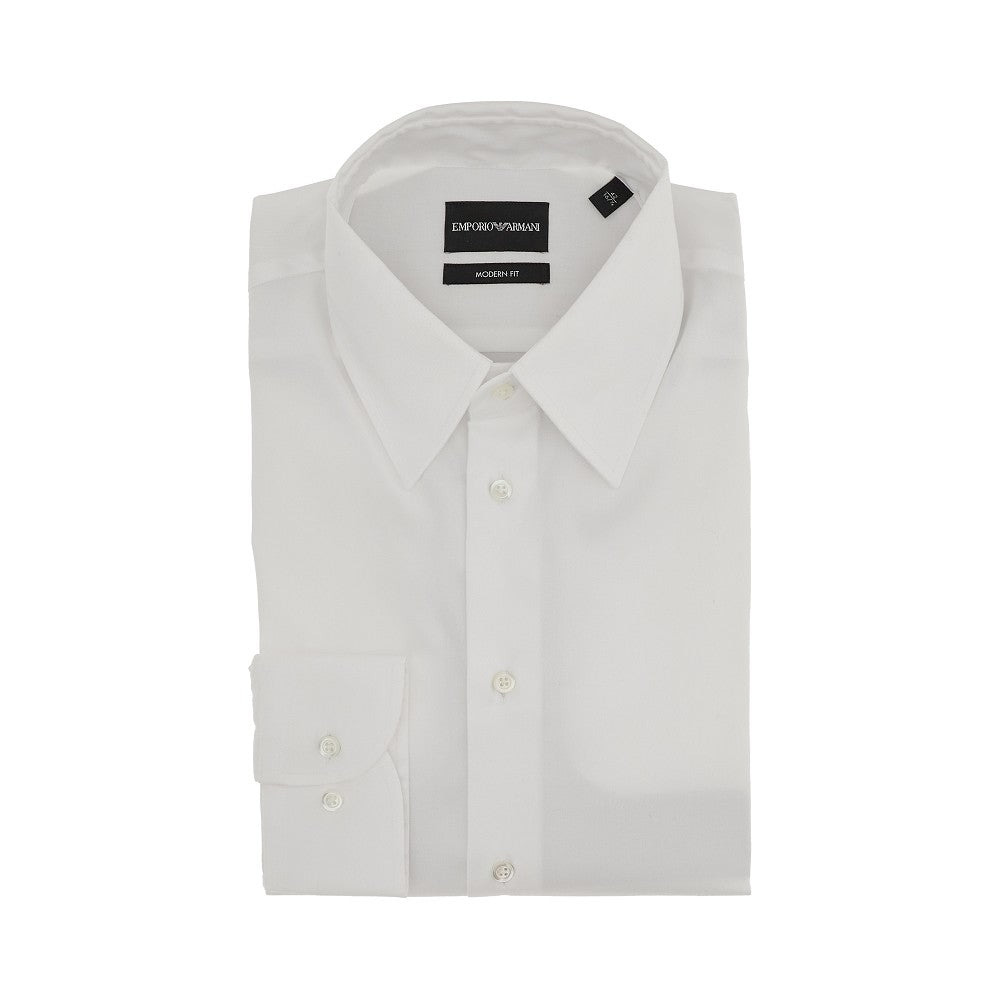 Shirt made from slightly stretch cotton twill. Pointed collar, mother-of-pearl buttons closure and adjustable rounded cuffs with buttons. Regular fit. DETAILS Codice Modello: EM000194 Stagione: FW24 Materiale: 98% CO, 2% EA Made in: Albania Sku: 14096 Brand: EMPORIO ARMANI