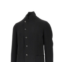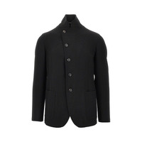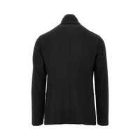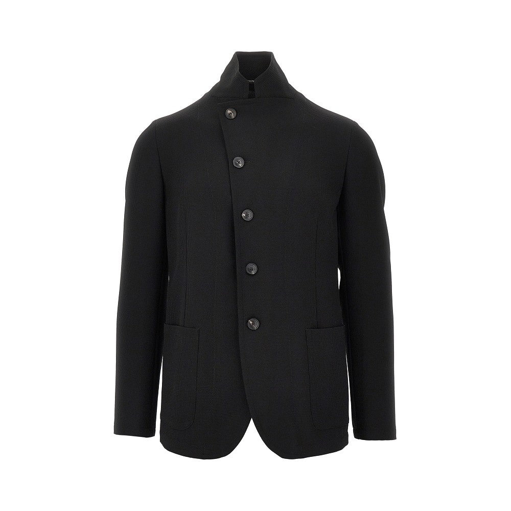 Jacket made from 3D piquet-effect stretch crepe jersey, featuring signature guru collar. Decentralized closure with horn buttons. Side patch pockets. Regular fit. Unlined. DETAILS Model code: EM000144 Color code: UC001 Season: FW25 Material: 100% EME Made in: Romania Sku: 28382 Color: Black Brand: EMPORIO ARMANI