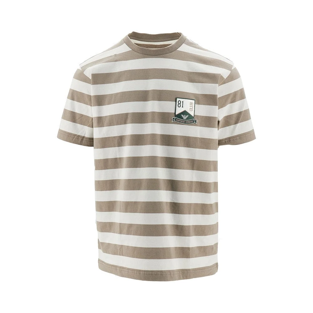 Short-sleeved T-shirt made from cotton jersey with striped motif, enriched with "Emporio Armani Club" patch on the chest. Micro ribbed crewneck. Regular fit. DETAILS Model code: EM004504 Color code: M1088 Season: SS26 Material: 100% CO Made in: Turkey Sku: 32443 Color: Beige Brand: EMPORIO ARMANI