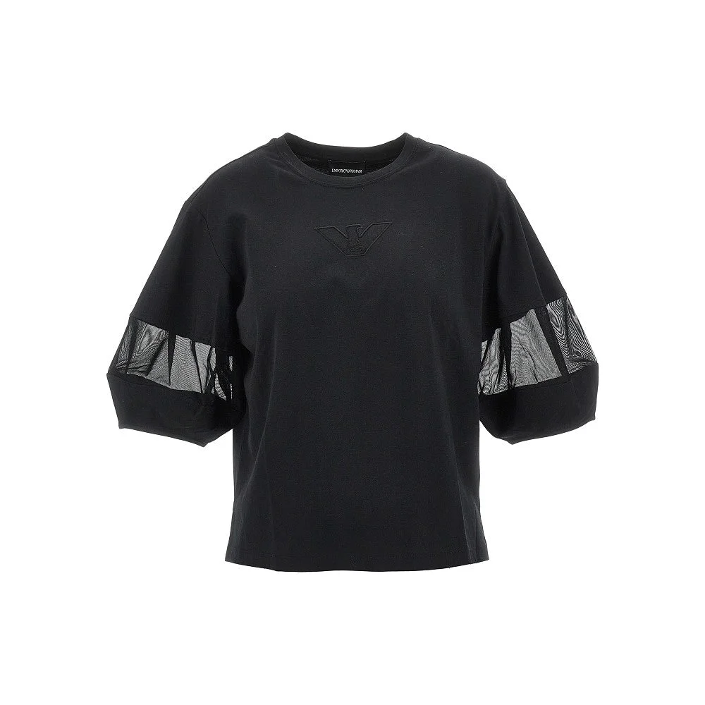 Crewneck T-shirt made from Supima cotton jersey, featuring short balloon sleeves with mesh inserts. Embroidered mesh Eagle logo patch at front. Short and relaxed fit with slightly dropped shoulders and side slits at bottom hem. DETAILS Model code: EW004390 Color code: UC001 Season: SS26 Material: 100% CO, 68% PA, 32% EA Made in: Turkey Sku: 31643 Color: Black Brand: EMPORIO ARMANI