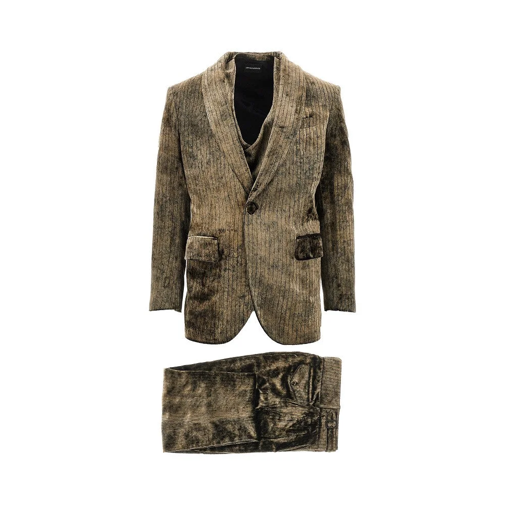 Three-piece suit made from velvet with jacquard pinstriped motif. Lined single-breasted jacket with shawl lapel collar, side welt pockets with flap, trimmed chest pocket and buttoned cuffs. Vest with adjustable strap at back. Wide leg pants with darts and criss-crossed adjustable straps at waist. DETAILS Model code: EM004187 Color code: U6203 Season: FW25 Material: 83% VI, 17% SE Made in: Italy Sku: 28989 Color: Brown Brand: EMPORIO ARMANI
