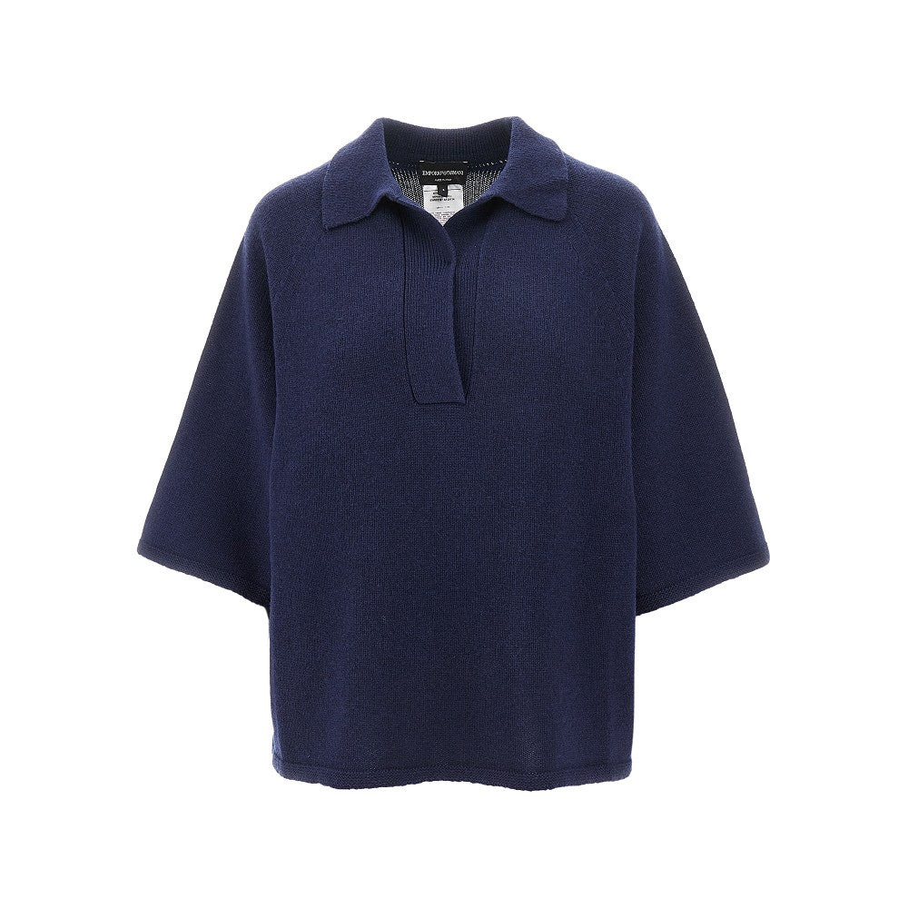 Sweater made from soft wool and cashmere blend yarn, featuring polo shirt like collar with V-shaped opening and wide elbow-length kimono sleeves. Relaxed fit. DETAILS Codice Modello: EW003197 Stagione: FW25 Materiale: 90% WV, 10% WS Made in: Italy Sku: 25664 Brand: EMPORIO ARMANI