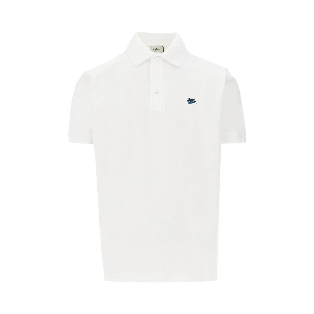Short-sleeved polo shirt made from cotton piquet, enriched with contrasting monogram and Pegaso embroidery on the chest. Micro ribbed collar and cuffs. Three buttons closure. Side splits. Regular fit. DETAILS Model code: MRMD0005 Color code: W0001 Season: SS26 Material: 100% CO Made in: Portugal Sku: 30334 Color: White Brand: ETRO