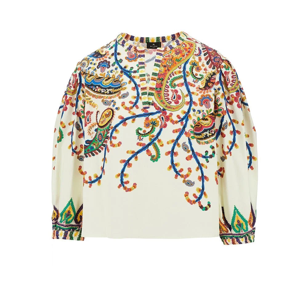 Blouse made from pure cotton poplin with multicoloured Paisley motif, featuring boxy silhouette with slightly dropped shoulders and 3/4 balloon sleeves with elasticated hem. Crewneck with V-split. DETAILS Model code: WRJA0088 Color code: X0800 Season: SS26 Material: 100% CO Made in: Italy Sku: 30380 Color: Multicolor Brand: ETRO