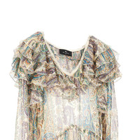 Maxi dress made from silk organdy with multicoloured Paisley motif, featuring ruffled flounces on the shoulders and V-neck with lace trimming. Bishop sleeves. Fluid silhouette with flounced skirt. Concealed side zip closure. DETAILS Model code: WRHA0566 Color code: X0804 Season: SS26 Material: 100% SE Made in: Italy Sku: 29718 Color: Multicolor Brand: ETRO