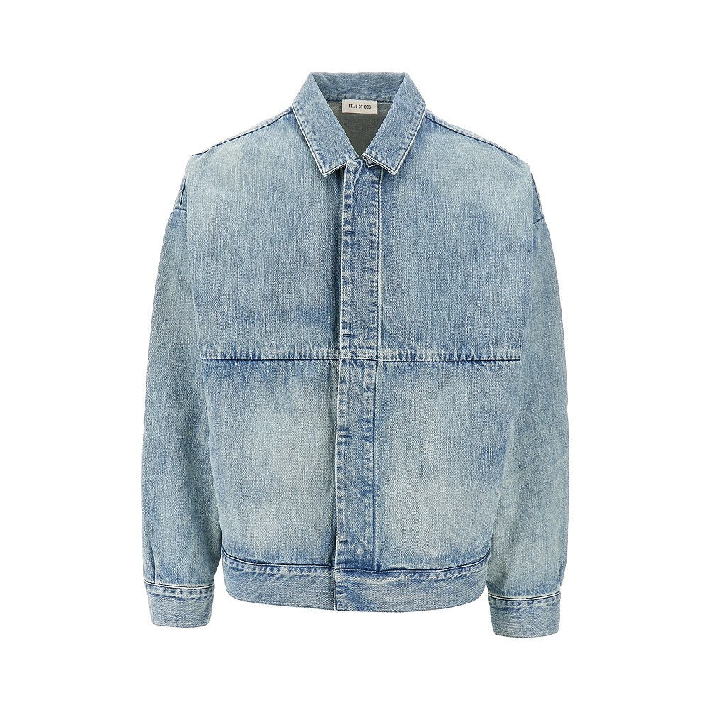 Jacket made from Medium Indigo cotton denim, featuring boxy and relaxed fit with slightly cropped length. Concealed front buttoning, classic pointed collar, side inseam pockets and cuffs with concealed button. Leather logo label at back. DETAILS Codice Modello: FGE230-318DNM Stagione: SS25 Materiale: 100% CO Made in: Japan Sku: 24975 Brand: FEAR OF GOD