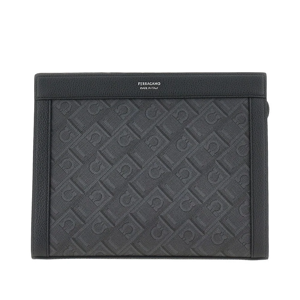 Pouch made from cotton-blend coated fabric with Ferragamo Monogram motif and grained leather edges. Silver-tone logo print on front, zip closure, leather wrist handle and fabric lining with two patch pockets. DETAILS Height: 21 cm Depth: 5 cm Width: 27 cm Model code: 779696 Color code: Season: SS26 Material: 41% PL, 9% CO, 50% PU, 100% LH Made in: Italy Sku: 32208 Color: Grey Brand: FERRAGAMO
