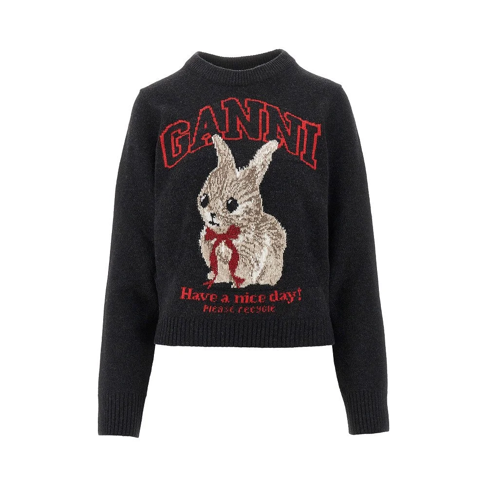 Sweater made from recycled wool blend yarn, enriched with front inlay with bunny and lettering logo. Ribbed crewneck, cuffs and bottom hem. Regular fit. DETAILS Model code: A1070047 Color code: 252 Season: SS26 Material: 45% WO, 35% REC WO, 20% REC PA Made in: Romania Sku: 29860 Color: Grey Brand: GANNI