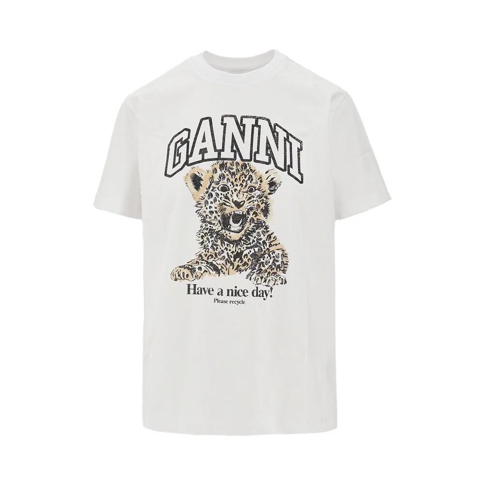 Short-sleeved T-shirt made from organic cotton jersey, enriched with front graphic print with leopard and logo. Micro ribbed crewneck. Relaxed fit. DETAILS Model code: T4124 Color code: 943 Season: SS26 Material: 100% ORGANIC CO Made in: Portugal Sku: 23108 Color: White Brand: GANNI