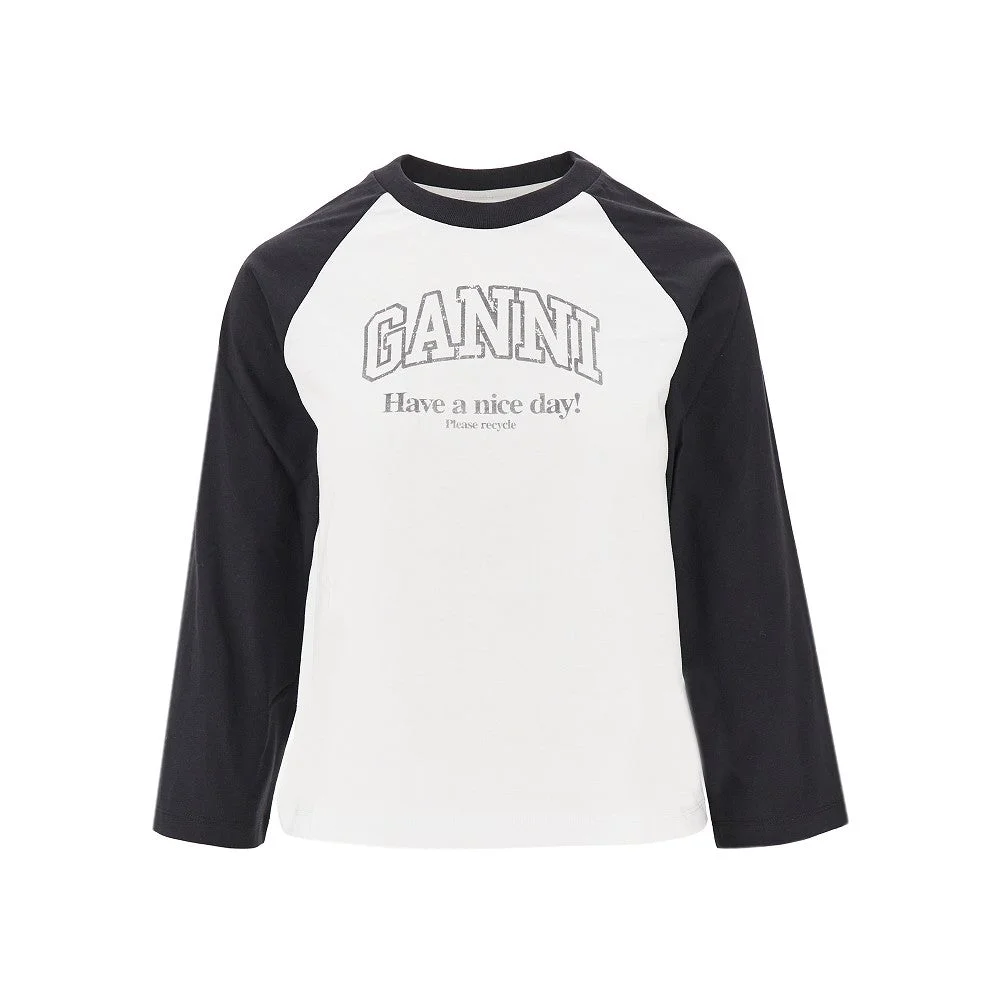 T-shirt made from organic cotton jersey, featuring contrasting 3/4 raglan sleeves. Front "GANNI Have a nice day!" print with faded effect. Contrasting micro ribbed crewneck. Slim fit. DETAILS Model code: A1050058 Color code: 151 Season: SS26 Material: 100% ORGANIC CO Made in: Portugal Sku: 30281 Color: White Brand: GANNI