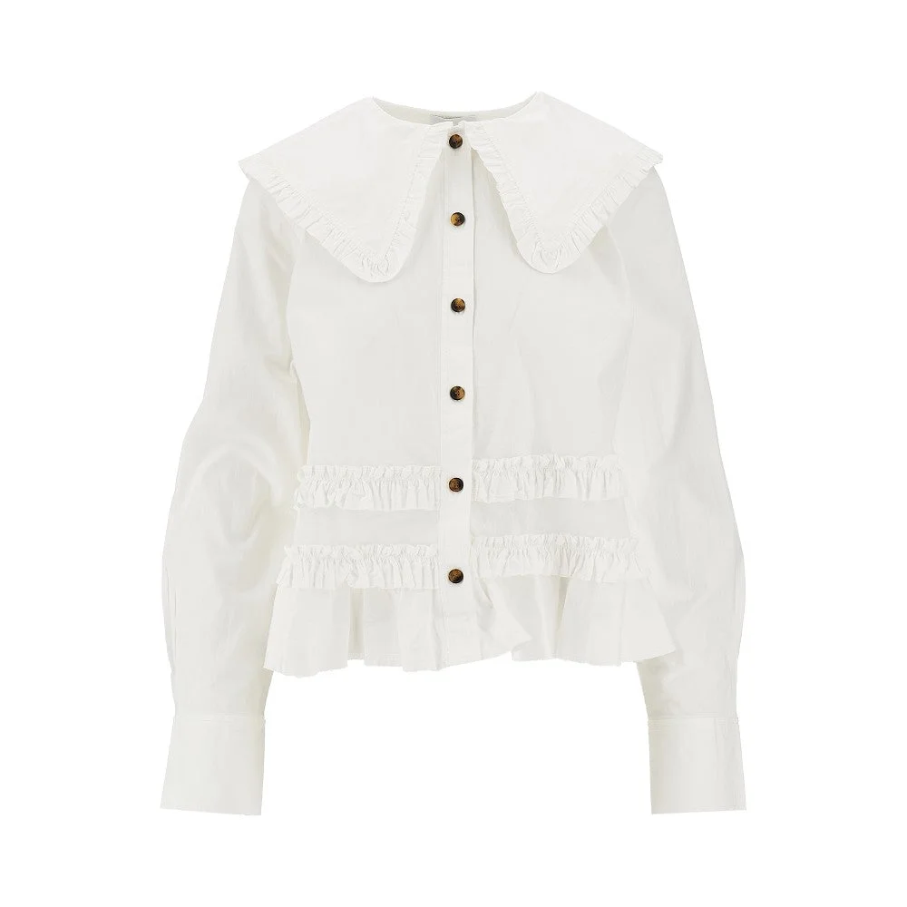 Shirt made from stretch organic cotton poplin, enriched with ruffled detailing at collar hem and at bottom. Two-button cuffs. Regular fit. DETAILS Model code: A1040096 Color code: ZZ8 Season: SS26 Material: 97% ORGANIC CO, 3% EA Made in: India Sku: 29846 Color: White Brand: GANNI
