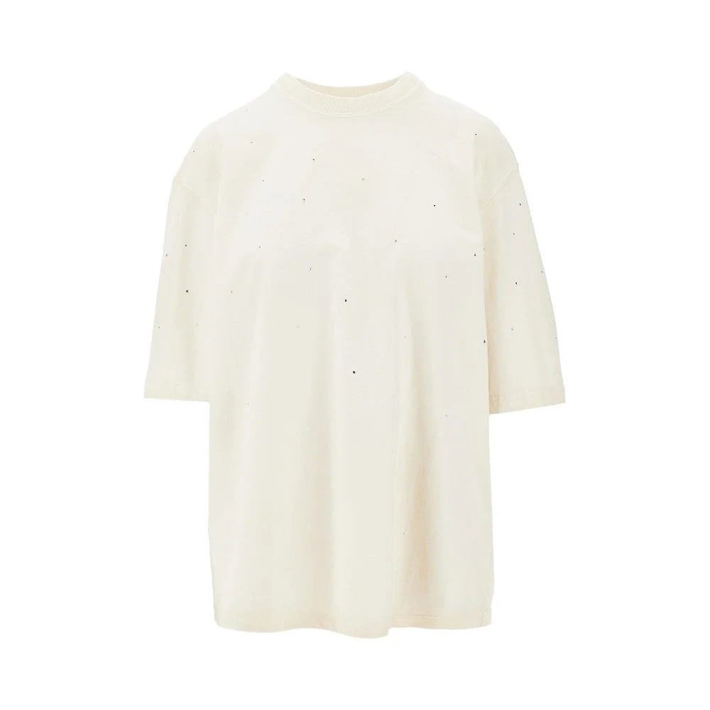 Short-sleeved t-shirt made from organic cotton jersey with vintage effect, featuring all-over rhinestone. Logo print and ruthenium-finished metal double star on the back. Micro ribbed crewneck. Relaxed fit. DETAILS Model code: GUP01873 Color code: 11616 Season: SS26 Material: 100% CO Made in: Italy Sku: 30233 Color: White Brand: GOLDEN GOOSE