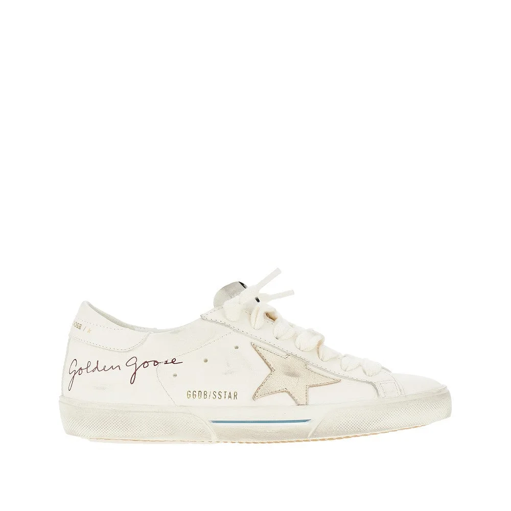 Sneakers made from smooth leather with used effect, featuring signature star patch in metallized leather and contrasting "Golden Goose" signature print at side. Suede leather tongue with fabric logo label. Terry fabric lining, removable leather insole and rubber sole. DETAILS Model code: GMF01015 Color code: 10847 Season: SS26 Material: 100% LH Made in: Italy Sku: 30133 Color: White Brand: GOLDEN GOOSE