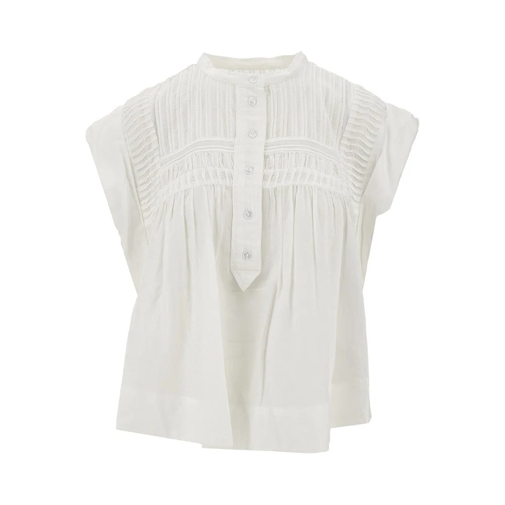 Top made from organic cotton blend voile, featuring stitched plisse motif on the upper part and wide cuffed sleeves. Crewneck and front buttons closure. Wide and flared silhouette. DETAILS Codice Modello: HT0456FA Stagione: SS25 Materiale: 80% CO, 20% VI Made in: India Sku: 20795 Brand: ISABEL MARANT ETOILE