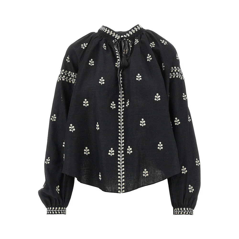 Blouse made from Tussar silk with embroidered motif. Standing collar with plunging V-neck with concealed hook and self-tie drawcordi with tassels. Long raglan sleeves with one-button cuffs. Wide and relaxed silhouette. DETAILS Model code: HT0826FA Color code: 01BK Season: SS26 Material: 100% SE Made in: India Sku: 33500 Color: Black Brand: ISABEL MARANT