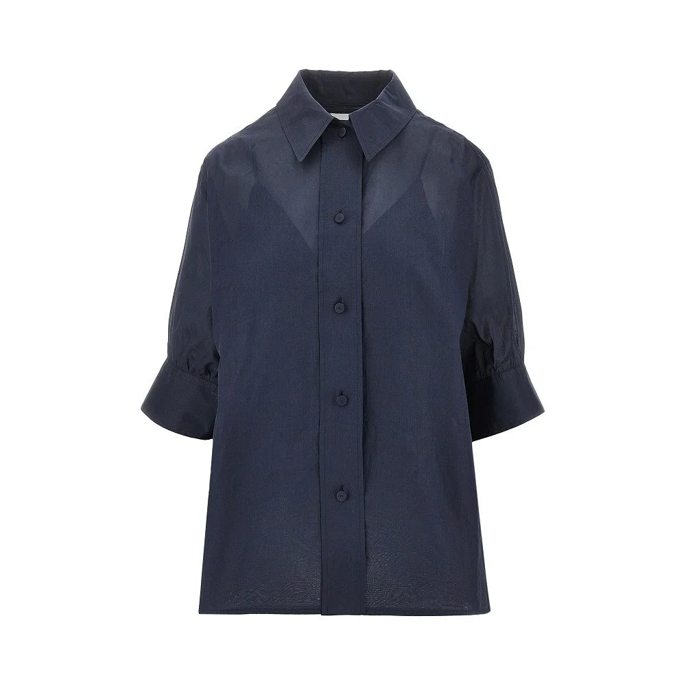 Shirt made from sheer cotton organdy. Front closure with fabric-covered buttons, pointed collar and short sleeved with one-button cuffs. Equipped with separated same fabric top. Wide silhouette. DETAILS Model code: J01DL0162 Color code: 402 Season: SS26 Material: 100% CO Made in: Italy Sku: 33177 Color: Blue Brand: JIL SANDER