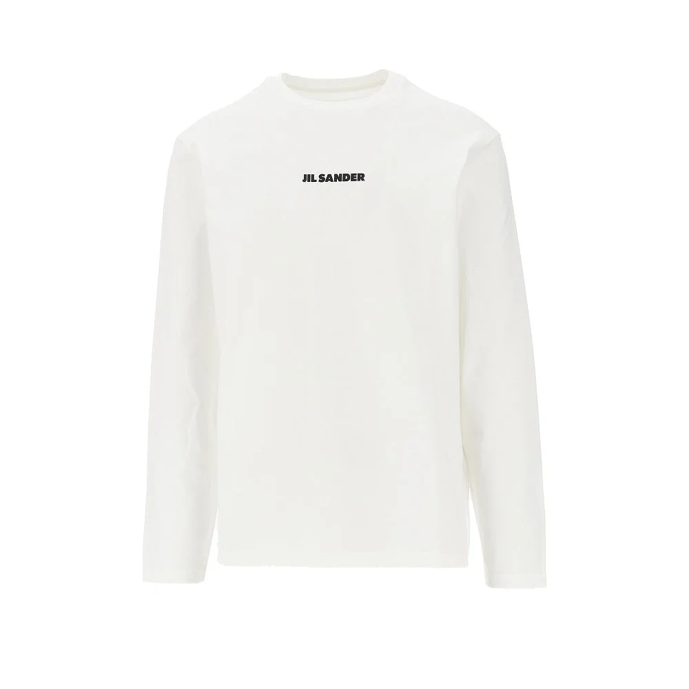 Long-sleeved T-shirt made from compact cotton jersey, enriched with contrasting lettering logo print at front. Micro ribbed crewneck. Regular fit with slightly dropped shoulders. DETAILS Model code: J22GC0236 Color code: 102 Season: SS26 Material: 100% CO Made in: Italy Sku: 29757 Color: White Brand: JIL SANDER