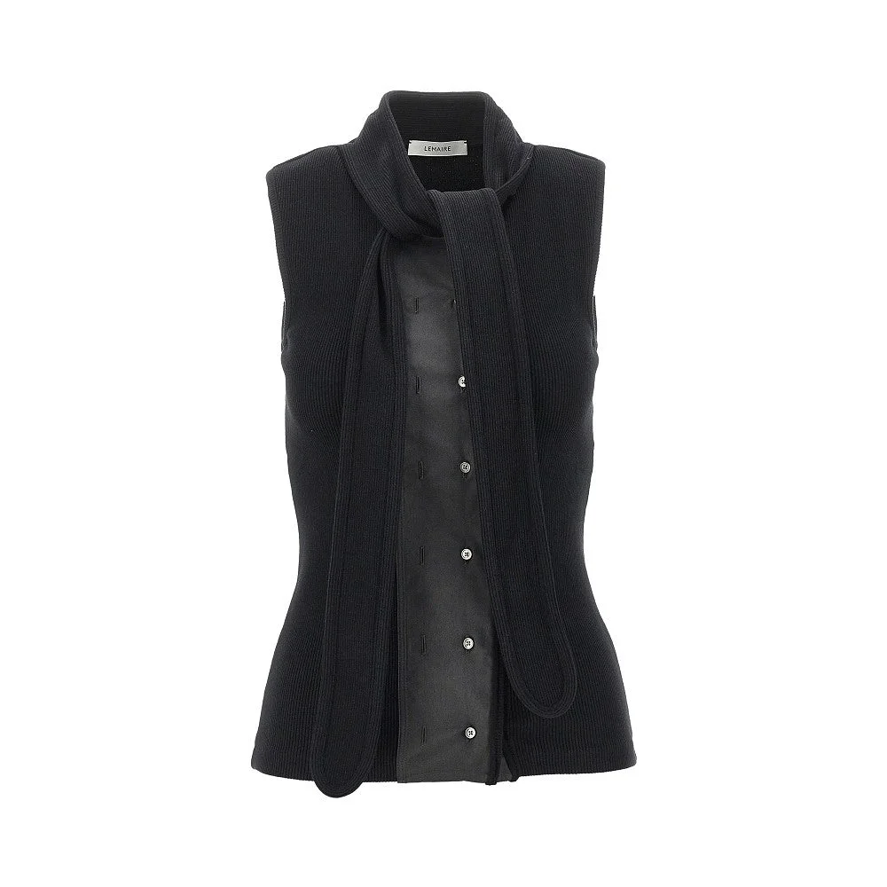 Tank top made from stretch cotton and linen blend jersey with ribbed motif, featuring front twill panel with double eyelets row and single-breasted mother-of-pearl buttons closure. Rounded neckline with integrated scarf. Fitted silhouette. DETAILS Model code: TS0004 Color code: BK999 Season: SS26 Material: 69% CO, 29% LI, 2% EA, 100% CO Made in: Portugal Sku: 32812 Color: Black Brand: LEMAIRE