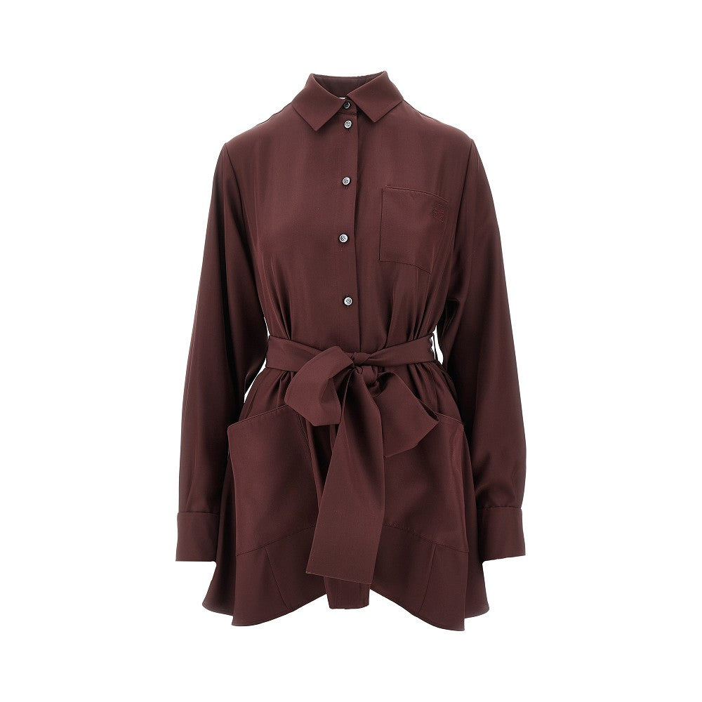 Shirt made from silk twill, featuring hip-length relaxed fit. Self-tie matching belt, pointed collar, front buttons closure, side patch pockets, chest pocket with tone-on-tone Anagram embroidery and cuffs with gold-finished metal cufflink. DETAILS Codice Modello: S359Y05XEV Stagione: FW25 Materiale: 100% SE Made in: Italy Sku: 26175 Brand: LOEWE
