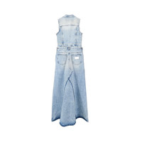 Sleeveless long dress made from light wash cotton denim with frayed edges, featuring modular construction that allows to decompose it into a vest and a skirt. Front buttoning, classic pointed collar and chest pockets. Five-pocket skirt with belt loops, zip fly, button closure and front split. DETAILS Codice Modello: S62DG0046 Stagione: SS25 Materiale: 100% CO Made in: Italy Sku: 20618 Brand: MM6