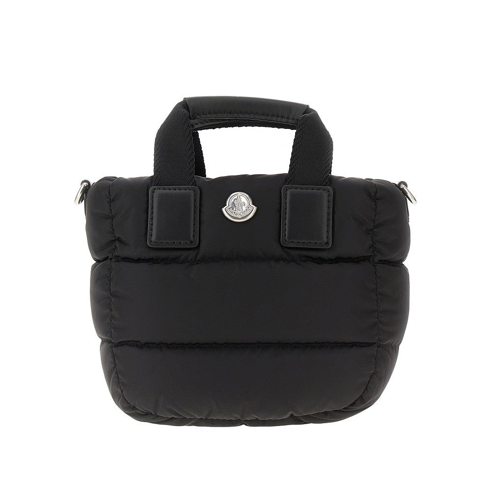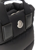 Micro tote bag made from quilted water-repellent nylon with goose down padding, enriched with silver-finished metal logo detail at front. Webbing handled with leather insert. Detachable and adjustable leather shoulder strap. Zip closure. Twill lining and one inner patch pocket. DETAILS Height: 15 cm Depth: 10 cm Width: 17 cm Codice Modello: K209B5L00004 Stagione: FW25 Materiale: 100%PA Made in: Italy Sku: 24603 Brand: MONCLER