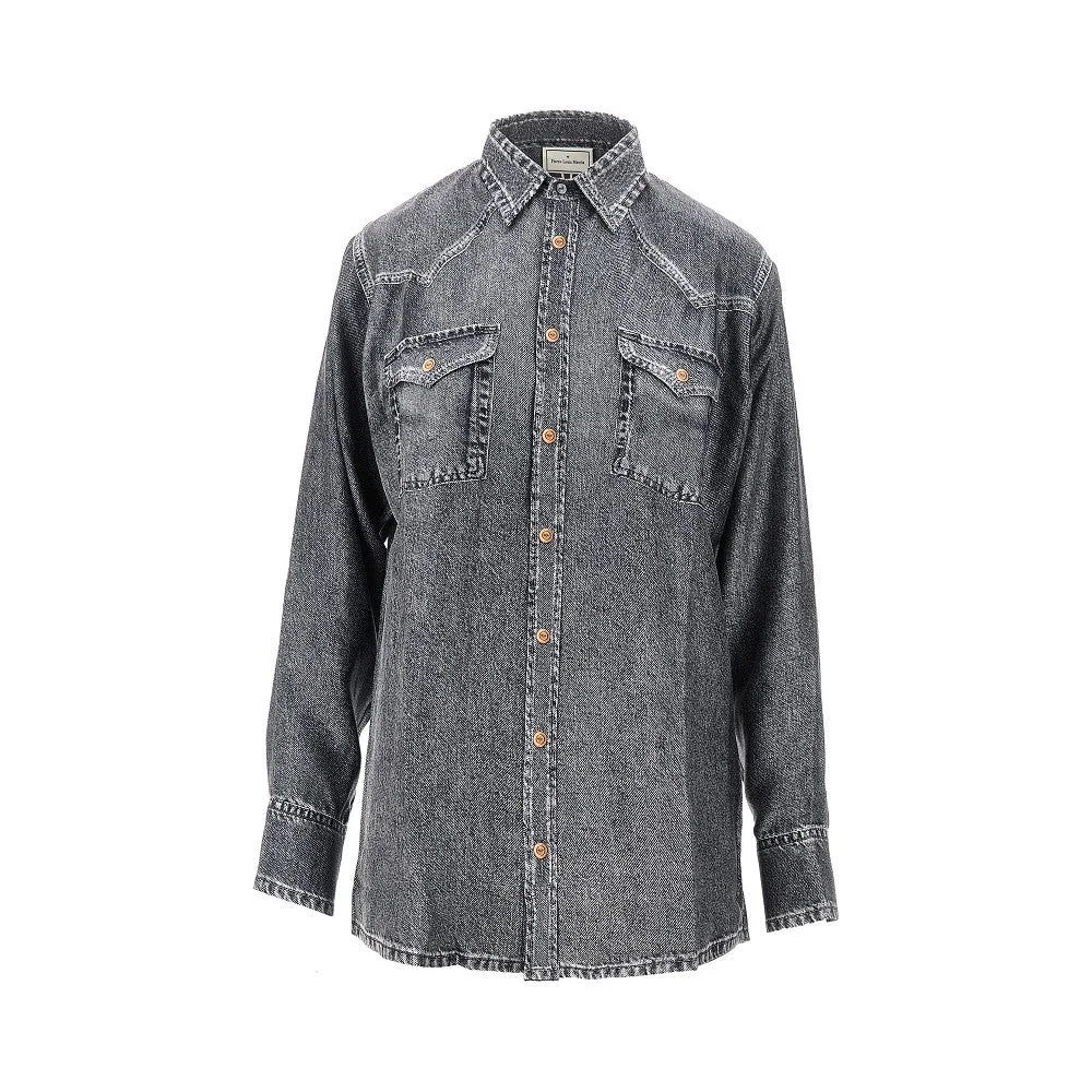 Shirt made from pure silk twill with denim effect print. Concealed buttons closure with printed buttons, classic pointed collar, chest patch pockets with flap, two-button cuffs and rounded longer back hem. Man-inspired straight cut. DETAILS Model code: ALOES-CML12657 Color code: 103 Season: SS26 Material: 100% SE Made in: Italy Sku: 26076 Color: Metal Brand: PIERRE LOUIS MASCIA
