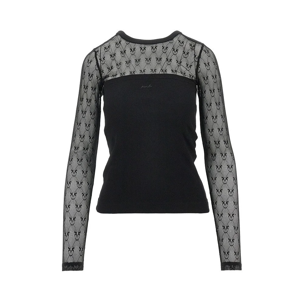 Long-sleeved top made from stretch cotton jersey with ribbed motif, featuring sleeves and top section in sheer Love Birds lace. Tone-on-tone lettering logo embroidery at front. Ribbed crewneck. Slim fit. DETAILS Model code: 106472 Color code: Z99 Season: SS26 Material: 97% CO, 3% EA, 92% NY, 8% EA Made in: Tunisia Sku: 34665 Color: Black Brand: PINKO